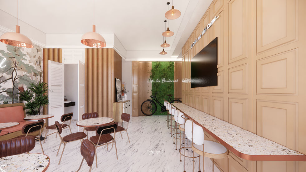 The design language is rooted in French aesthetics, featuring soft pastel tones, vintage wooden furniture, and ornate detailing that echoes the romance and sophistication of a Parisian bistro. Arched doorways, wrought iron accents, and textured wall finishes enhance the authenticity, while the layout promotes comfort and conversation. Each corner of the café has been thoughtfully curated to balance functionality with charm—creating an inviting ambiance perfect for both leisurely afternoons and vibrant social gatherings.